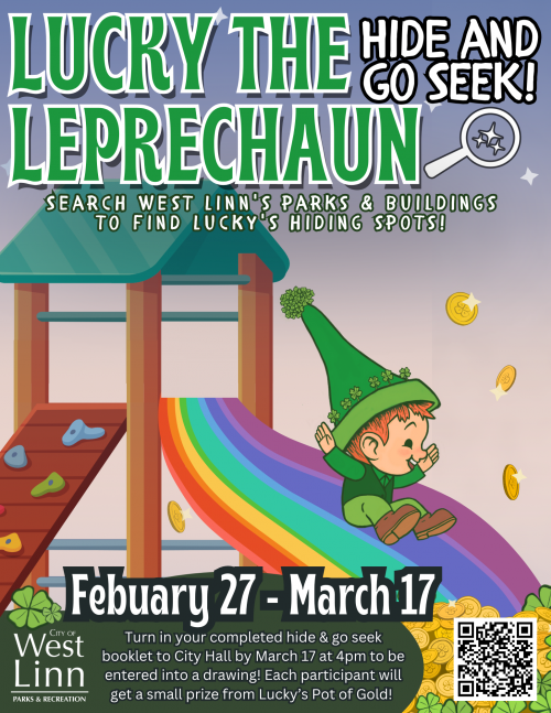 BetweenFeb 27th and 17th, search West Linn's best hidden places to find Lucky's hiding spots!